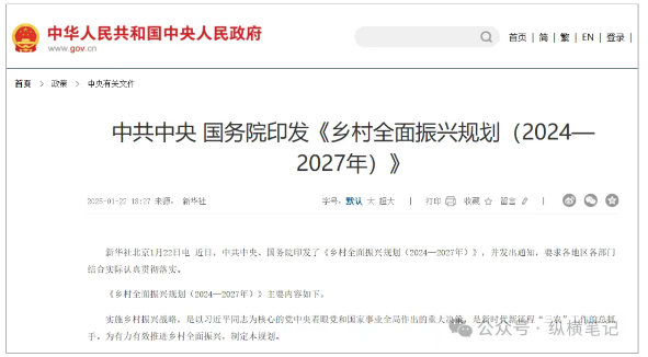 《乡村全面振兴规划(2024—2027年)》指出:(九)构建现代乡村产业体系。培育现代乡村产业,做好“土特产”文章,发展乡村种养业、加工流通业、休闲旅游业、乡村服务业。以农产品主产区和特色农产品优势区为重点,打造现代乡村产业走廊,实施农业品牌精品培育计划。优化产业链组织方式,培育农业产业化龙头企业,支持企业协同共建产业链供应链。建强产业发展载体,支持县域农村产业融合发展项目建设,发展优势特色产业集群。(十)深化农村一二三产业融合发展。实施农产品加工业提升行动,支持主产区建设加工产业园。完善流通骨干网络,改造提升批发市场,布局建设城郊大仓基地,实施农村电商高质量发展工程。有序发展农事体验等新业态,探索现代农业、休闲旅游、田园社区融合发展方式。